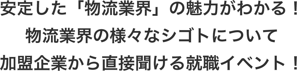 「物流の仕事」と聞くと、ドライバーを思い浮かべる方も多いかもしれません。しかし、物流業界にはドライバーだけなく、一般事務や倉庫作業、営業、物流管理など、様々な仕事があります。面談会に参加すれば、安定の物流業界にある幅広い仕事の中で、あなたに合う仕事に出会えるはず!