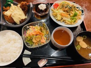この日はチキンカツタルタルソースと焼うどん。