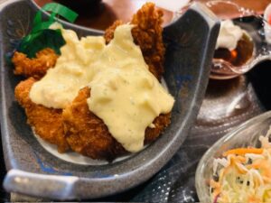 サラダで体を整え、タルタルソースがたっぷりとかかったチキンカツを頬張ります。
