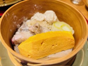 蒸物 鱈白子の飯蒸し、桃かぶの肉巻き、下仁田ねぎ、出汁巻き玉子のせいろ蒸し