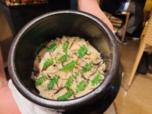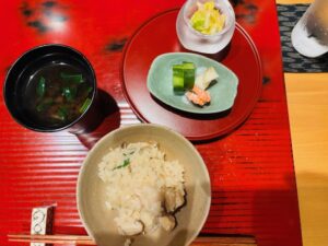 御飯物 鰤と新玉ねぎ、原木椎茸の炊き込みご飯、ちぢみ法蓮草の赤出汁