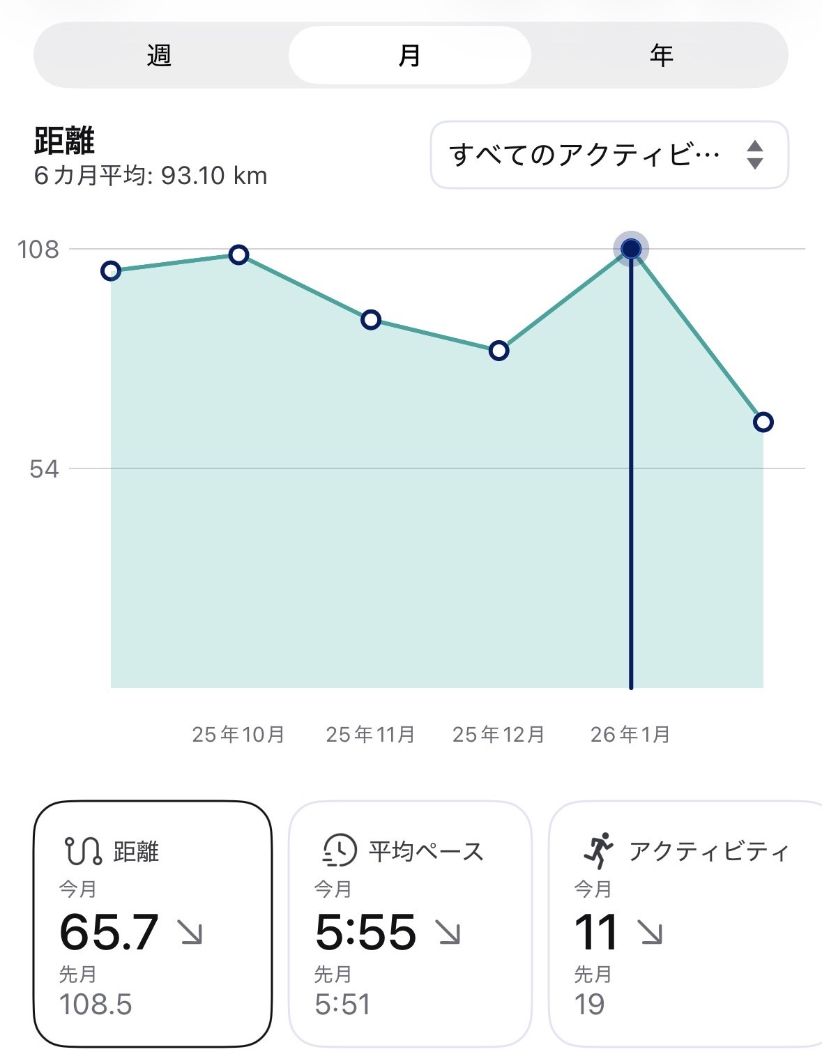 半月を終えたところで65kmとかなりの余裕。